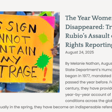 By Melanie Nathan, August 24, 2025 The U.S. State Department’s Human Rights Reports began in 1977, mandated by legislation passed the year before. For nearly half a century, they have provided an unbroken, year-by-year account of human rights conditions across the globe. Published annually, usually in the spring, they have become an indispensable reference for … More The Year Women Disappeared: Trump and Rubio’s Assault on Human Rights Reporting