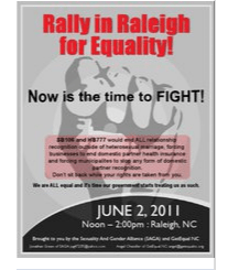 Earlier in the afternoon, hundreds of North Carolinians attended the “Rally in Raleigh” organized by GetEQUAL NC and local activist Jonathan Green. The rally focused on SB106, the discriminatory bill that would put an amendment on the 2012 ballot that would prevent private businesses and municipalities in NC from offering domestic partnership insurance benefits, and invalidate Domestic Partnership Registries in the three cities in NC that offer them (Chapel Hill, Asheville and Carrboro).