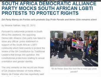 It would seem that Lance Weyer has really put his foot in it with this one on his own BLOg where he shows by way of admission his allegiance to the DA http://lanceweyer.blogspot.com/2012/05/why-da-is-only-party-for-lgbti-south.html – renders him unfit as ambassador for both positions MRGAY SA the world ambassador for LGBTI in SA and MR DA career politician.