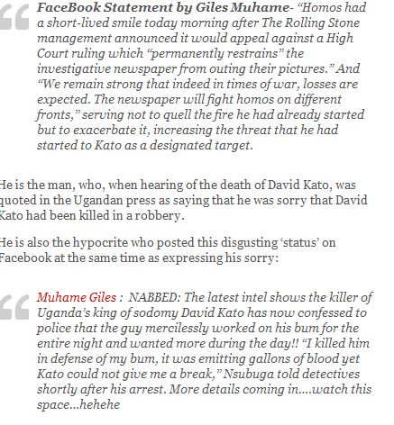 In the meantime Giles Muhame has called for the death of gays in Uganda and named them and that is how his record stands.
