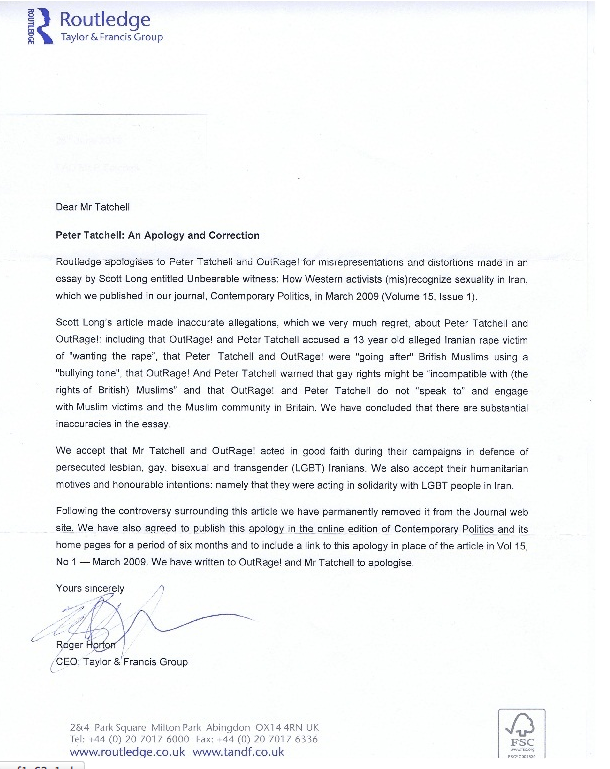 The full and unreserved apology to Peter Tatchell and the LGBT human rights group OutRage! has been made by Roger Horton, the CEO of Routledge’s parent company, Taylor and Francis.