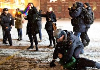 (Gay activists being denied their right to assemble in Moscow’s Red Square, before the start of the Olympics. Credit: Reuters.)