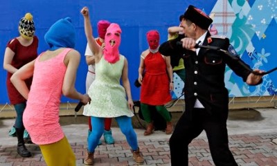 (Russian policeman about to strike Pussy Riot musicians on Feb. 19, near Sochi. Credit: Morry Gash, Associated Press.)