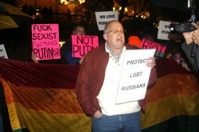 Nearly thirty gay and feminist campaigners and their allies came out to hold signs reading “Gay is OK! Russia”, “We Love Pussy Riot!”, “Protect LGBT Russians”, and many dressed in the iconic clothing favored by the original Russian band. Some of the protesters adopted the name Pussy Riot/SF for tonight’s actions. Also present were members of Gays Without Borders.
