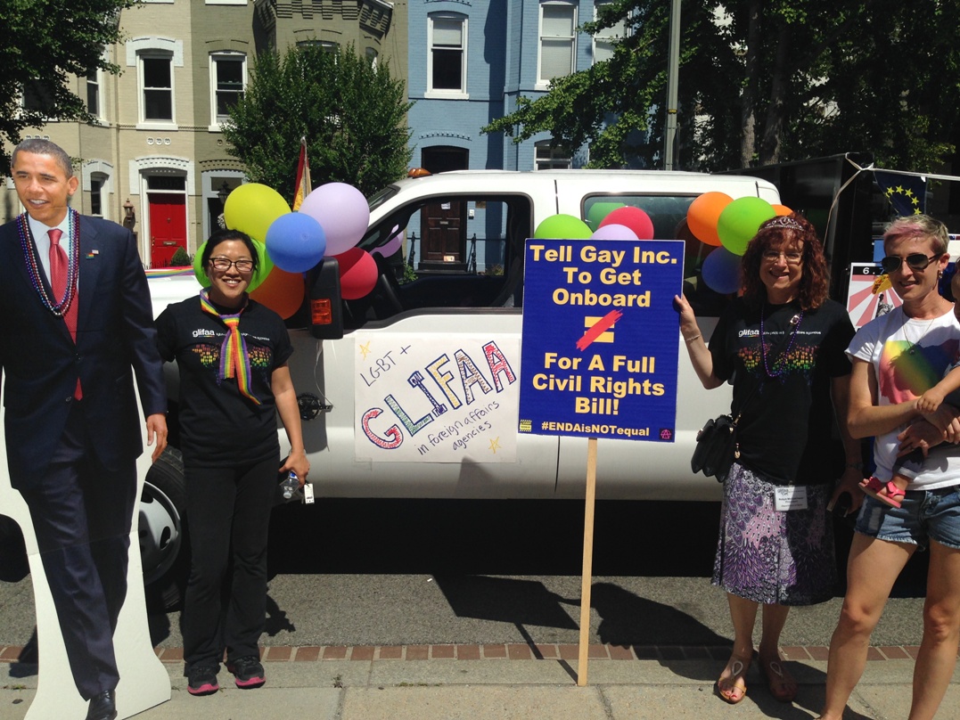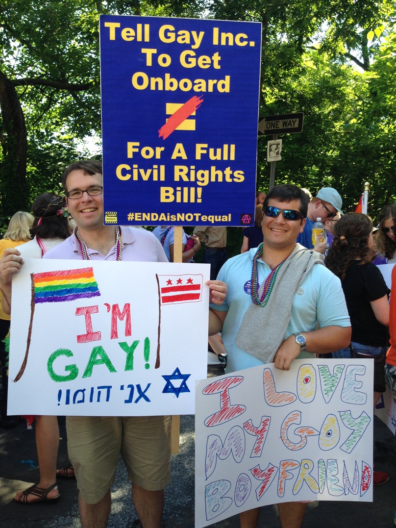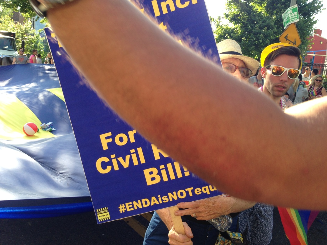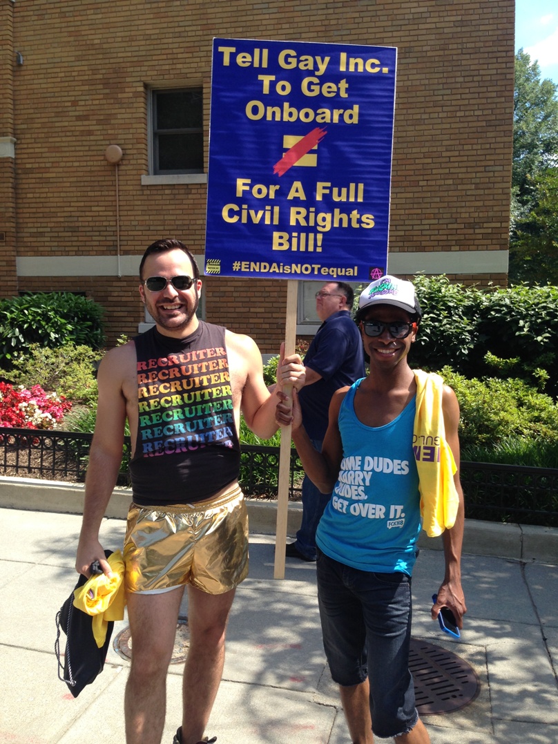 With that in mind, we thought we’d take Queer Nation NY’s #ENDAisNOTequal message directly to HRC at the Capital Pride Parade in Washington D.C… not sure they enjoyed the message, but many others did! And hey Dykes On Bikes – when did the pursuit of civil rights become such a political statement?