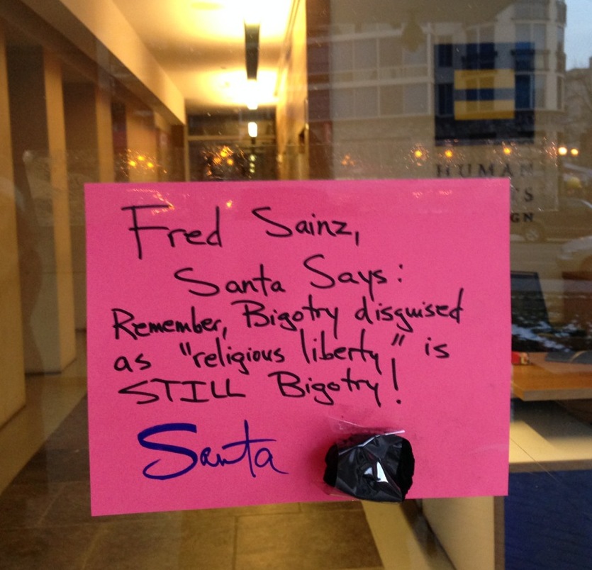 Special message to Fred from Santa: Some career advice, if you can’t separate your role as “gay rights leader” at HRC from your role as staff person on Jeb Bush’s presidential campaign then Fred Sainz, like Mike Huckabee, you need to leave your day job to hit the presidential campaign trail full time.