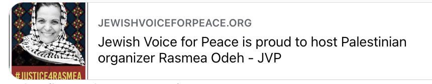 AMONG ODEH ‘S SUPPORTERS ARE JEWISH VOICES FOR PEACE, the anti-Zionist organization that works actively against Israel’s existence.
