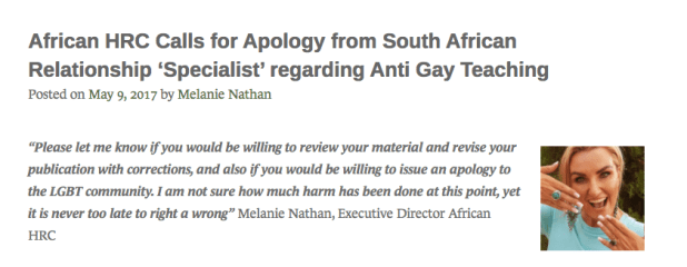 So I wrote her in my capacity as the Executive Director of The African Human Rights Coalition, asking for a correction and an apology and then attached my letter to an article, here: https://oblogdeeoblogda.me/2017/05/09/african-hrc-calls-for-apology-from-south-african-relationship-specialist-regarding-anti-gay-teaching/ . I know as a general rule the fundamentalist religious zealot type never yield and certainly did not expect her to respond, and that she would likely remain steadfast on her path. After all an apology would not serve the motivation.
