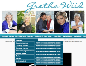 This is all very profitable – DVD’s, children and teen camps, school workshops, events, and her aims at control and oppression and profit are masked by the mission she reflect at www.grethawiid.co.za Notably, “Hoekom ons doen wat ons doen” – meaning “Why do we do what we do.” She tells the story of her marriage and its deliverance from pornography and adultery – together with MAN Francois, saved from divorce. And so in sharing their experience she attempts to sway women into her ideal and promises it will all lead to a great marriage. She blames everything on childhood hurts and does not attribute any blame or responsibility to men, patriarchy and that form of dominance over women. The very type of society that fostered Apartheid – where women knew their place!