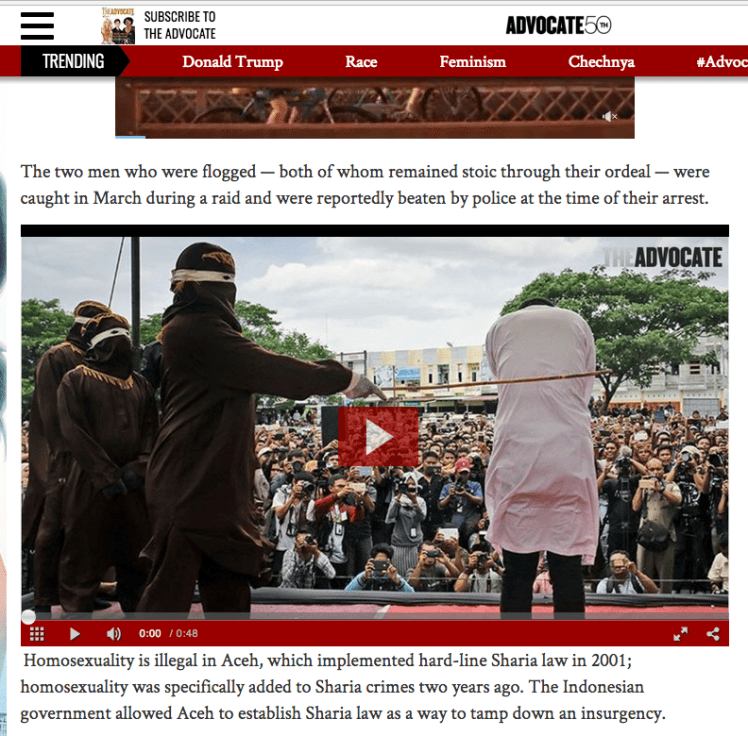 The Advocate Magazine quite rightly posted an online article informing its readers about the public beating in Aceh, Indonesia of 2 gay men, who were allegedly caught having gay sex. Through noting its link, the Advocate picked the article up from a report in the South African Press. Indeed it was correct to report this as important awareness creating news. However I am totally disgusted and perplexed by the fact that the advocate actually showed the video of the young men being beaten and the crowd cheering, without any regard to concealing their identity.