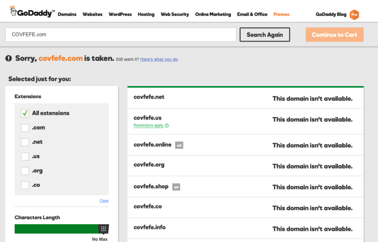 And within minutes of its explosion into our lives every dot anything domain was immediately taken – from COVfefe.com to COVfefe.org to .net .biz . me and even .ME :