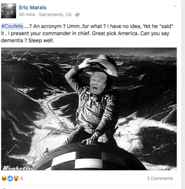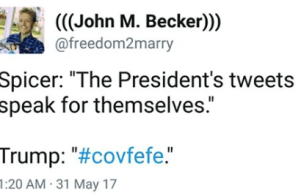 Upon return from his disastrous first presidential tour abroad, plagued by a ferocious Russian controversy, finally there is some good news for Donald J. Trump. Within minutes of his smartest Tweet to date from this Twitter crazed 45th President of the United States – HIS mother of all tweets went viral – and is continuing to spiral out of control as I write! This is the Tweet that is sure to have the BIGGLIEST influence on all Americans, if not the entire Globe- after all it makes much more sense than anything else Tweeted to date by the country’s FIRST MORON: “Despite the constant negative press Covfefe …”