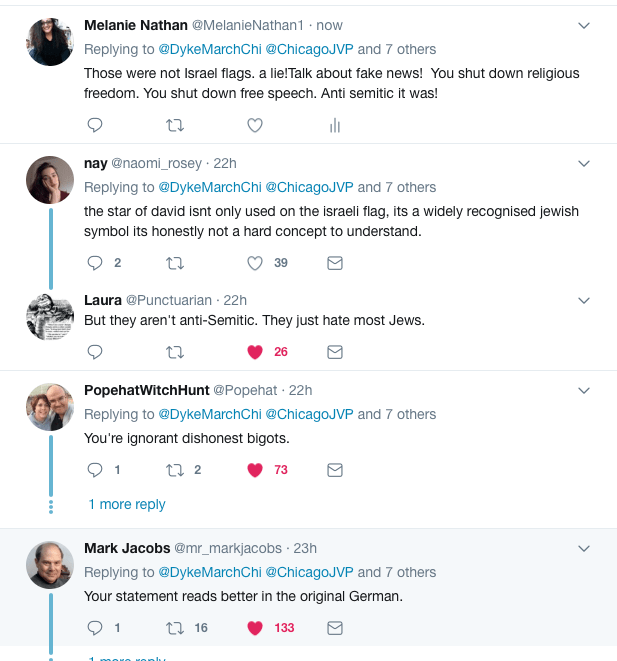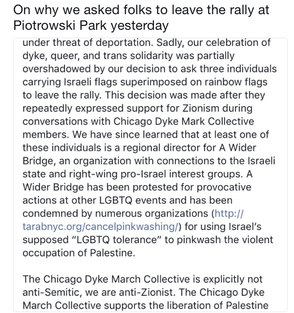As a Jew who supports freedom of all religions – and the right for all to march in Pride- I am waiting for an apology from the organizers of Dyke March, Chicago: Dykes of Chicago – unless you come out against what happened – you embarrass and shame me. You offend me. You insult me. Do not pretend to be open to full intersectionality until you embrace all LGBTQI individuals of any religion.