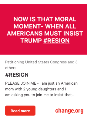 WE the people of the United States of America call upon DONALD J. TRUMP to #RESIGN the presidency of our beloved country.