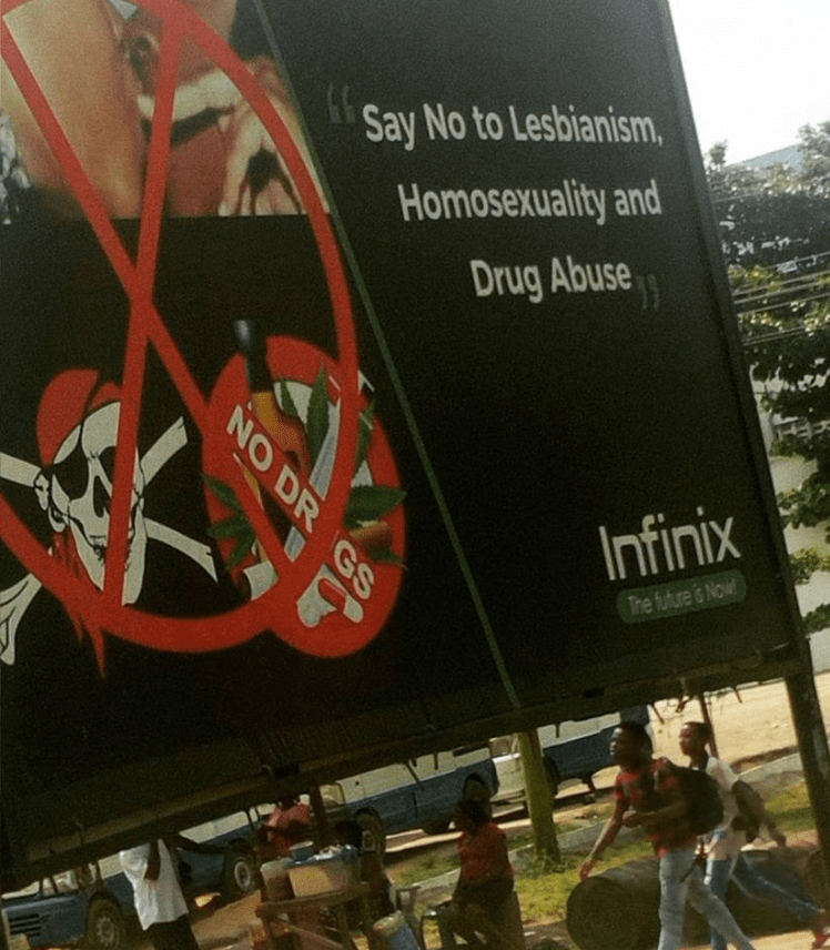 Universities such as the University of Port Harcourt [UNIPORT] now has a large billboard near its campus with the homophobic slogan “Say No to Lesbianism, Homosexuality and Drug Abuse” sponsored by Infinix. It was also reported that the Rivers State University of Science & Technology [RSUST] and University of Benin [UNIBEN] also has similar billboards all sponsored by Infinix as part of its anti-corruption campaign.