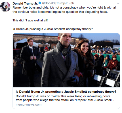 4. As Trump Jr. and all those hateful right wingers are tweeting up a gleeful storm right now about how bad the lying LEFT is because of a Smollet Hoax, we cannot lose sight of the clear truth and fact: