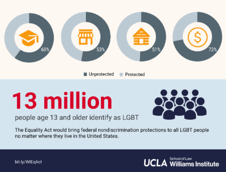 “The Equality Act would make crystal clear that discrimination against LGBT people is prohibited under federal law and would help to remedy the widespread harassment and discrimination that LGBT people experience at work, school, and when trying to get basic services and goods,” said Jocelyn Samuels, Executive Director of the Williams Institute.