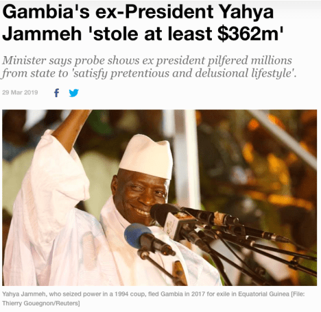 According to OCCRP, and other media outlets, for more than two decades of rule, the past president Yahya Jammeh of Gambia, a tiny West African country known for tropical beaches and tranquility in a region often rocked by conflict, did nothing much but pillage the country, and I add, a whole lot of screaming for the throat slitting of homosexuals. It is said he stole in excess of $300,000,000! He is yet to be charged. Jammeh seized power in a 1994 coup d’etat, and then fled The Gambia in 2017 for exile in Equatorial Guinea as an African regional force closed in on the capital Banjul to enforce his election loss to President Adama Barrow.