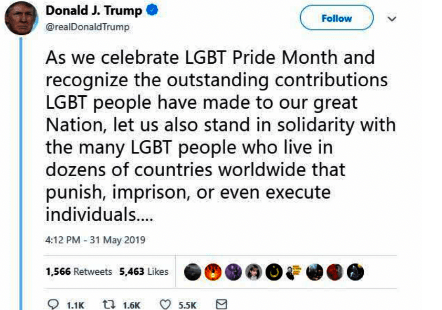 UPDATED: 06/03/2019: Noticeably trump as President in his drive for a 2nd term may did not do much to push his so called support of Pride. while he tweeted it from his own account, notary here has been zero retweet by The White House, VP, and official presidential social media accounts. There is also no proclamation or official statement on any website. The message has also not been retweeted by the usual surrogates, including his sycophant family. However it did not go unnoticed by certain rabidly anti gay organizations: