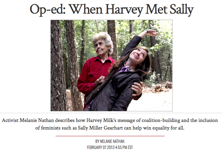 I am the coproducer of this documentary, which is scheduled to wrap after the United States Supreme Court rules on the Defense of Marriage Act and Proposition 8 cases. Throughout production, I sat in on the interviews with Sally. It became clear that she felt hurt at being snubbed by the film, but she was more concerned that the critical feminist role had been excluded from Milk.