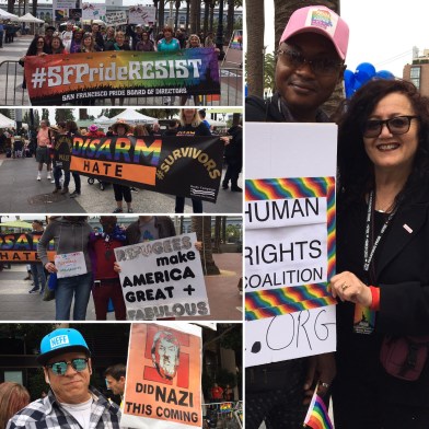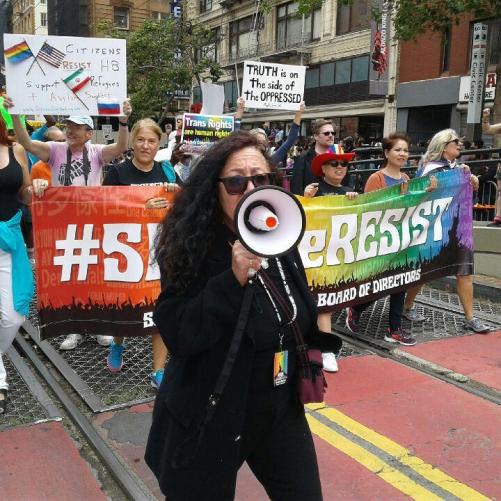 Leading the SF Pride Parade with Board’s resistance contingent-Carrying the SF Women’s March front banner with Mayor London Breed and Rep. Barabara Lee and other SF Women leadersLeading Women’s March resistance protest against Trump caging children and separating families- with Joan Baez