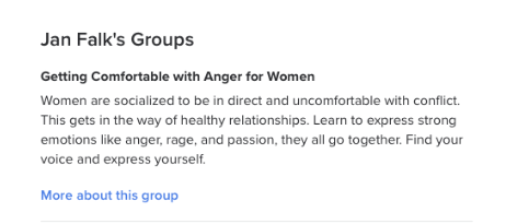 I feel compelled to post this because I wonder if an Israeli showed up to her workshop about women and anger, if they would be made to feel welcome. And YES lets talk about who is qualified to lead groups on women and anger! This screenshot from her webpage…