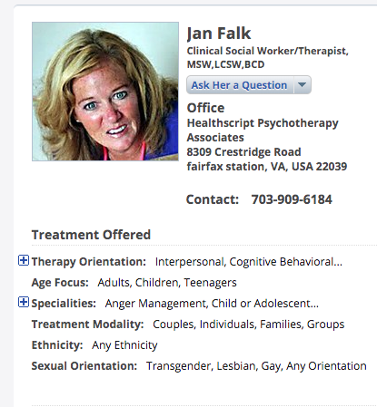 Jan falk is unlicensed as a social worker a psychotherapist. That makes her a bold – faced liar, a fraud and a quack. She is rumored to have moved from Virginia to Oregon in pursuit of a relationship with an alcoholic man. Yet, she was employed by the oregon court to ruin my sister’s life and place my nephew in the custody of his father’s murderers.