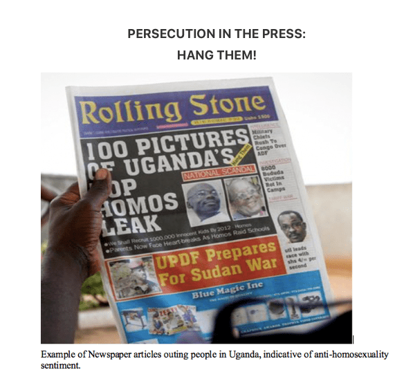 What followed amounted to a notably significant rise in the anti-homosexual sentiment in Uganda. A Ugandan tabloid, “Rolling Stone” in 2010 published the pictures of known LGBT activists and community members, alongside the caption “Hang Them.” This exposure was not only lethal to the individuals exposed, but also was seen to bring shame upon the families of the gays and lesbians who were exposed. This resulted in a heightened consciousness about detecting LGBT people and led to a ‘witch hunt,’ causing much terror among LGBT people. Many of those who were exposed (outed) had to go into hiding, losing livelihood and homes. Some were able to leave Uganda. In later years Red Pepper Magazine also published “Uganda’s Top 200 Homos” and other articles outing LGBTQI people. From then on Minister of Ethics and Integrity Simon Lokodo spent years raiding events and hunting gays.