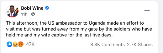One thought on “U.S. Ambassador Denied Access to Ugandan Presidential Candidate Bobi Wine under House Arrest”