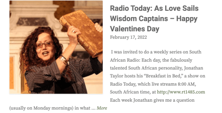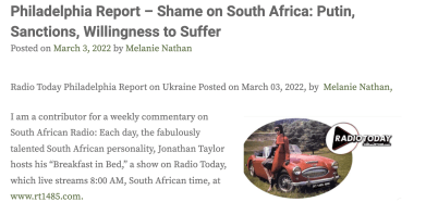 THE PHILADELPHIA REPORT – I was invited to do a weekly series on South African Radio: Each day, the fabulously talented South African personality, Jonathan Taylor hosts his “Breakfast in Bed,” a show on Radio Today, which live streams 8:00 AM, South African time, at www.rt1485.com