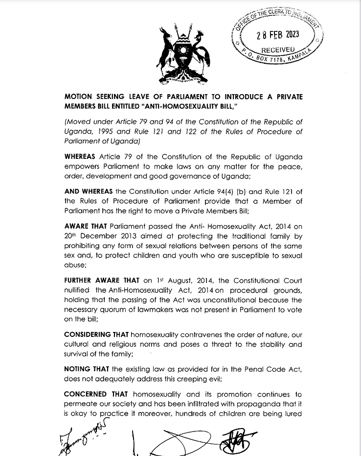 According to The Order Papers of Feb 28, 2023, the Agenda of Uganda’s Parliament and the Speaker of Parliament, Ms Anita Among, a Motion for legislation targeting further criminalization of Uganda’s LGBTQI+ community is currently being tabled before Parliament, that in effect seeks to reintroduce some form of the old Anti-Homosexuality Bill, known as The Kill The Gays Bill, that was voided by the Ugandan Court in 2014.