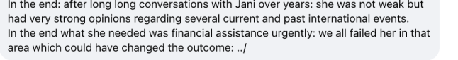 THAT ALL SAID, well done dear Jani. You did it. It is absolutely fitting. Perfect for you to leave this world in a flurry of controversy. Speaking out is who you were. Your peace rests in speaking loud. For what is right.  Many love you forever, unconditionally, notwithstanding the things we did not agree about. And so we left that church for a nearby restaurant to talk and feel Jani, the real Jani.
