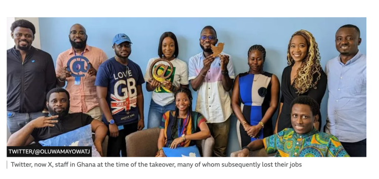 Semafor Africa notes: “Former African staff members at social media company X (formerly Twitter) told the BBC they plan to take legal action against their former employer for allegedly failing to pay redundancy funds promised after they were laid off last November. The nearly 20 employees worked at the company for less than a year. They had just moved into X’s new office in Ghana’s capital, Accra, when their contracts were terminated. The closure of X’s sole office on the continent was also blamed for the increased spread of misinformation due to the lack of content curators to flag inappropriate content. The closure of X’s sole office on the continent was also blamed for increased spread of fake news as there were no more content curators to flag inappropriate content.”