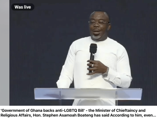 The Minister of Chieftaincy and Religious Affairs, Hon. Stephen Asamoah Boateng: ‘Government of Ghana backs anti-LGBTQ Bill’ – According to him, even though the draft law was initiated by Sam George and others,, “I am backing him, I am backing the churches, I am backing the Moslems, I am backing the traditional authorities.” “We do not want to see this gay matter, whatever in Ghana. Never, it won’t happen,” he said during his speech at the last Sunday service at Perez Chapel International in Accra on December 31, 2023. He claims he is leading the government’s position to oppose LGBTQ and “what I say is what government is going to do.” Sam George, an Elder of the church, was seen applauding and smiling to the speech which seems to have increased his hopes of the Bill’s passage and government’s support. (VIDEO LINKS HERE)