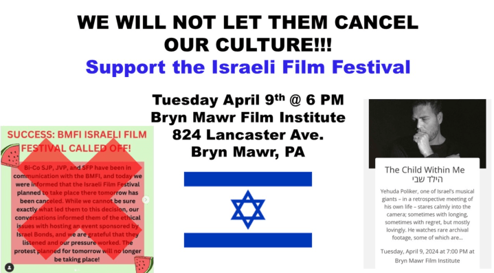 “Bryn Mawr Film Institute has cancelled its screening of an Israeli film (nothing to do with the war btw) because its filmmaker is a Jewish Israeli. Had it been a non-Jewish Israeli, it would not have been cancelled. Think about that folks! It was supposed to show tomorrow.”