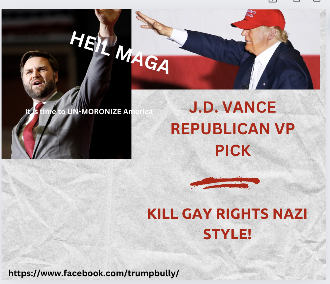 The record of J.D. Vance, the looming Project 2025 , and Trump revenge, which fosters Heritage Foundation and Evangelical homophobia, yields the perfect storm – a symbiotic convergence of draconian ideals and agenda that will send all LGBTQI+ rights into the sewers!