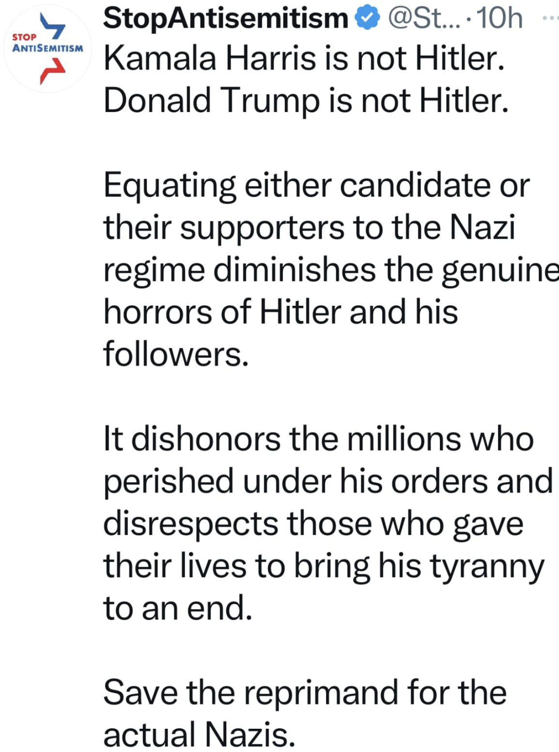 Firstly I am not even going to begin to address the feeble attempt at equating Kamala Harris to Trump in any way shape or form. There is not one piece of evidence or word out of mouth justifying this. Trump is the one who reads and quotes Mein Kampf. Trump is the one who supports Nazis such Proud Boys and praises Hitler. Trump is the one who dines with David Duke and Nick Fuentes. Trump is the one who idolizes despots. Trump is the one who uses antisemitic tropes. Now lets talk about the rest of it.
