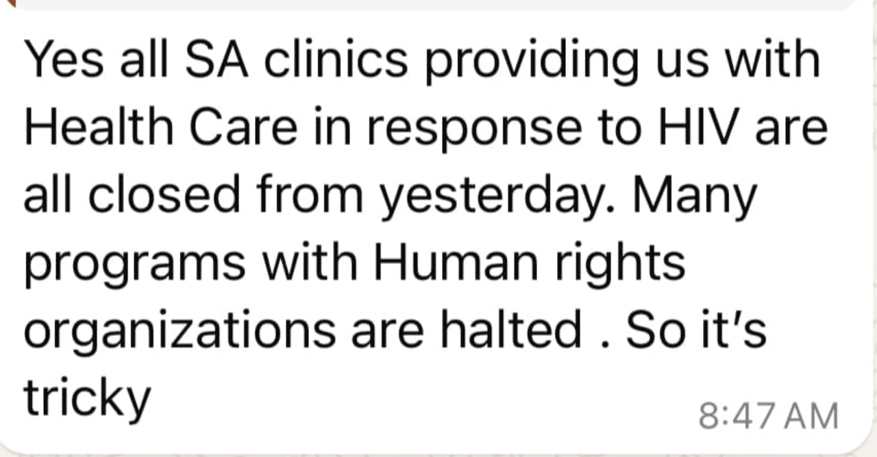 The fallout is overnight and massively injurious to the most vulnerable of people: Clinics that provide healthcare and HIV+ medications and services have closed overnight, leaving the most vulnerable populations in the lurch and in a state of panic. This extends to hundreds of thousands of people being locked out of their breadwinner jobs across the continent. And so much more.