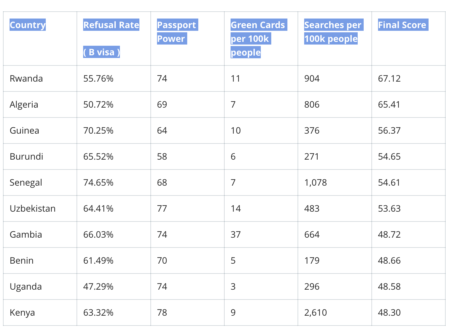 Rwanda leads the ranking with a score of 67, facing substantial immigration barriers to the US. The country grapples with a 55.76% B visa refusal rate while receiving only 11 Green Cards per 100K citizens. Rwanda shows significant interest in US immigration with 904 searches per 100K people, indicating strong desire among citizens to relocate that contrasts sharply with the limited opportunities available.