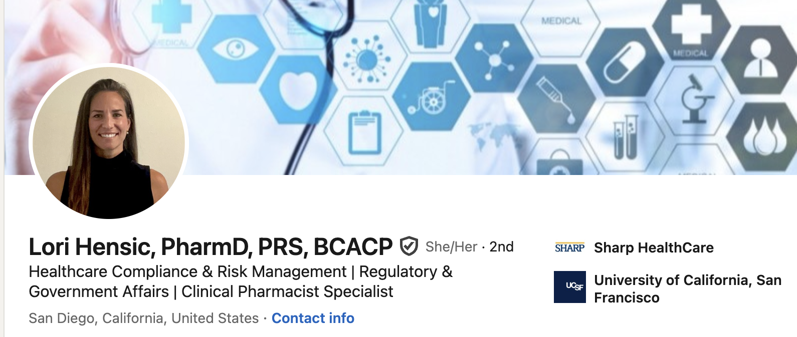 Lori Hensic, PharmD, PRS, BCACP She/Her, Healthcare Compliance & Risk Management | Regulatory & Government Affairs | Clinical Pharmacist Specialist https://www.linkedin.com/in/lori-hensic/ “