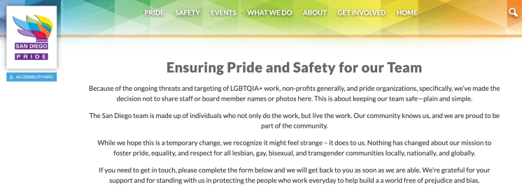 Because of the ongoing threats and targeting of LGBTQIA+ work, non-profits generally, and pride organizations, specifically, we’ve made the decision not to share staff or board member names or photos here. This is about keeping our team safe—plain and simple.