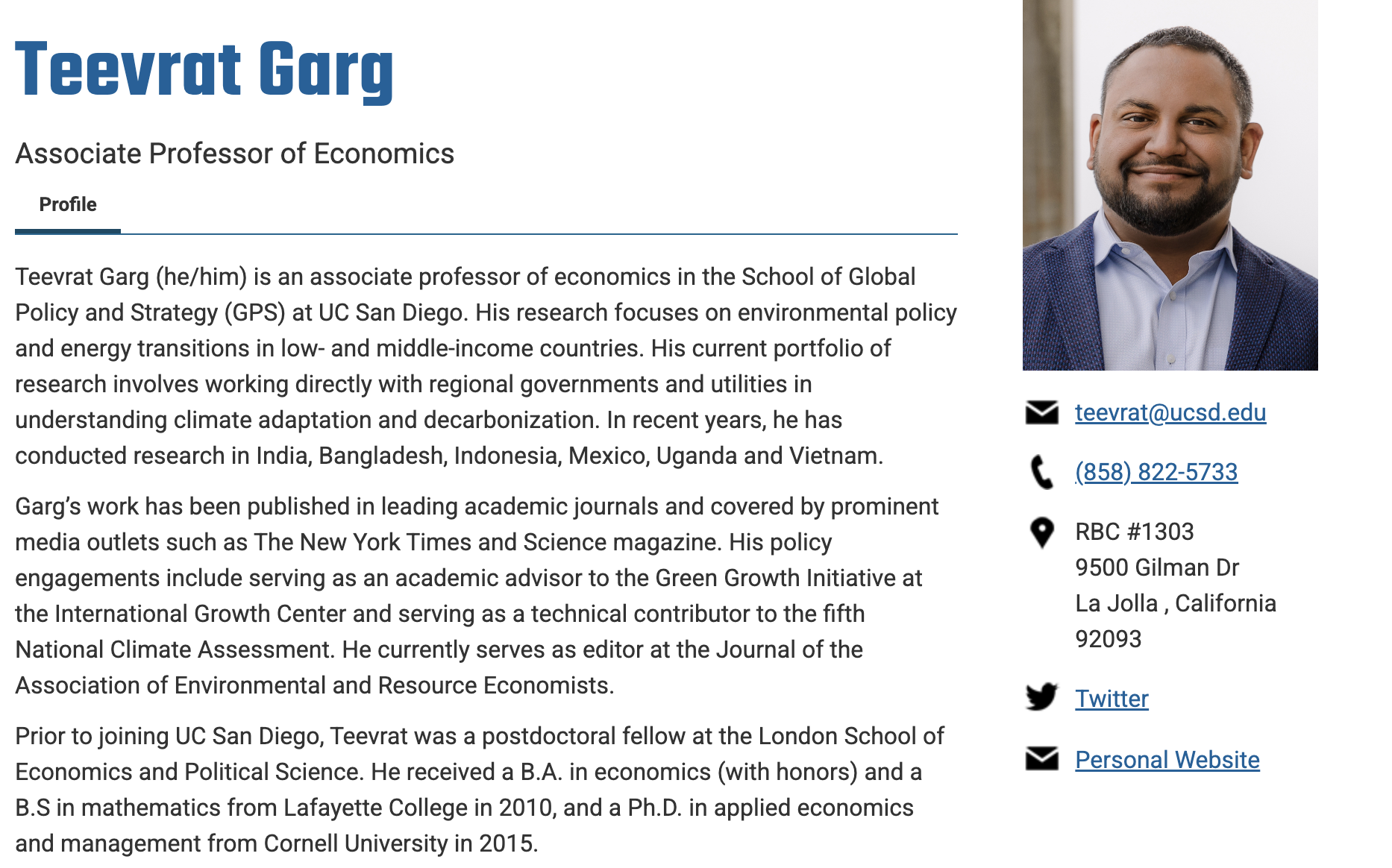 (he/him) is an associate professor of economics in the School of Global Policy and Strategy (GPS) at UC San Diego. His research focuses on environmental policy and energy transitions in low- and middle-income countries. His current portfolio of research involves working directly with regional governments and utilities in understanding climate adaptation and decarbonization. In recent years, he has conducted research in India, Bangladesh, Indonesia, Mexico, Uganda and Vietnam. Garg’s work has been published in leading academic journals and covered by prominent media outlets such as The New York Times and Science magazine. His policy engagements include serving as an academic advisor to the Green Growth Initiative at the International Growth Center and serving as a technical contributor to the fifth National Climate Assessment. He currently serves as editor at the Journal of the Association of Environmental and Resource Economists. https://gps.ucsd.edu/faculty-directory/teevrat-garg.html