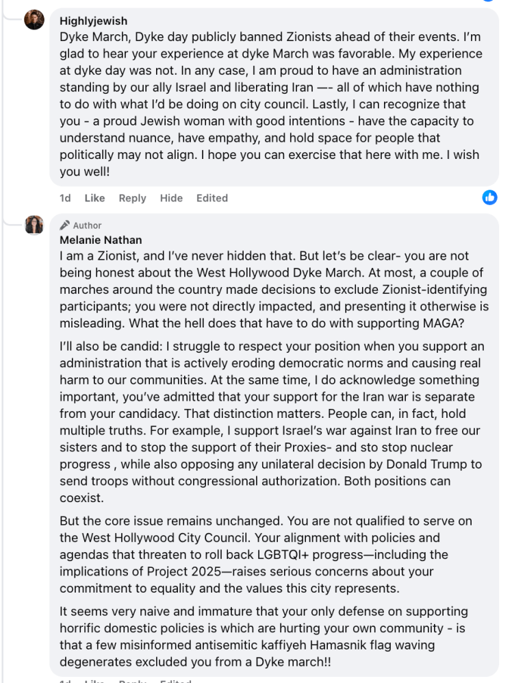 In her campaign, she leans heavily on identity, refugee roots, Jewish, Zionist, lesbian. On paper, those identities mirror my own. That is precisely why I speak. I also speak to honor all those before me, and alongside me. I also speak for the future of our youth. There is more to be done.