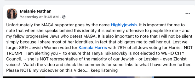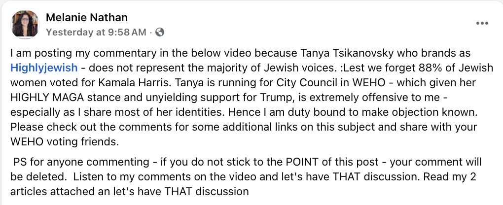 Tanya Tsikanovsky, who brands herself as “highlyjewish,” is seeking a seat on West Hollywood’s City Council, a role that demands moral clarity, historical awareness, and a commitment to protecting the vulnerable. My message is: Identity is not qualification, and leadership in West Hollywood insists on judgment grounded in morality and maturity.