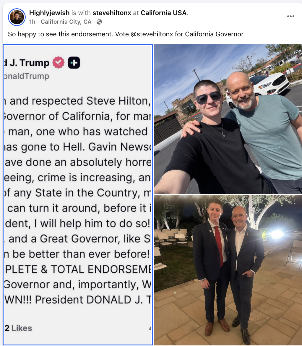 On the opposite end, is Tanya Tsikanovsky, using the handle HighlyJewish. Another galloping Trojan horse who mirrors the same dynamic, but from the extreme right. She wraps herself in pro-Israel advocacy, which resonates deeply in a moment of rising antisemitism, yet beneath that banner sits an alignment with hardline MAGA conservatism and policy agendas tied to Project 2025. Today she bragged the endorsement of ultra right winger Steve Hilton – running for Governor in California, who in turn is bragging the endorsement of Donald J. Trump, the President currently embroiled in the Epstein pedophilia scandal and cover -up, an historic low disapproval rating of 68%, while sporting 34 felonies! Nice bedmates!