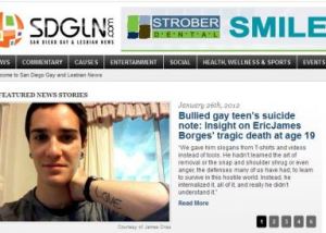 “Bullied gay teen’s suicide note: Insight on EricJames Borges’ tragic death at age 19 — In an exclusive story on SDGLN, Contributor Melanie Nathan of San Francisco wrote about the tragic suicide of bullied gay teenager EricJames Borges, who worked for The Trevor Project and advocated against bullying of LGBT youth. Nathan attended one of the teen’s funerals, met his family and obtained a copy of one of his suicide letters. SDGLN Editor in Chief Ken Williams and Nathan discussed at length the merits of sharing Borges’ final thoughts, and came to the conclusion that his message needed to be shared for its insight and as a way to publish suicide-prevention tools for vulnerable teenagers. More than 21,000 people read the story, 384 people liked the story on Facebook, 34 people tweeted, another 37 shared on other Social Media, and dozens of people commented via Facebook. The story was picked up by countless LGBT and mainstream media sources.”