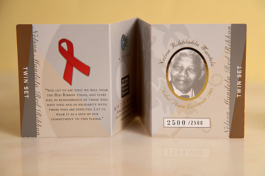 The 2,500 limited edition two piece set, consisting of a half ounce gold and one ounce silver, depicts Nobel Prize recipient and former South African President Nelson Mandela’s image on the obverse and the AIDs ribbon on the reverse, together with his renowned quote: