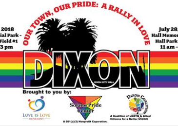 LOVE IS LOVE MOVEMENT AND SOLANO PRIDE PRESENT FIRST ANNUAL DIXON PRIDE JULY 28 History will be made, tomorrow in Dixon, California.  At Hall Memorial Park, the Love is Love Movement and Solano Pride will host “Our Town, Our Pride: A Rally in Love” from 11 a.m. – 3 p.m. The first-ever Dixon Pride event … More Dixon to Hold First Pride Overshadowing Vice Mayor’s Hate with Love